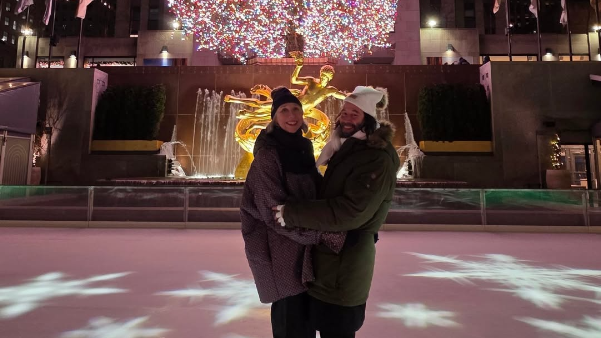 На фото влюбленные позируют на фоне гигантской украшенной елки, уверенно держась на коньках. На видео видно, как они помогают друг другу скользить по льду, а кульминацией становится страстный поцелуй на фоне праздничных огней.